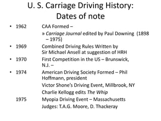 This document provides a retrospective overview of key events in the history of carriage driving in the United States from the 1960s through the 1980s. It discusses the formation of early organizations like the CAA and ADS, as well as notable early competitions. It then summarizes America's rise to international success in the 1980s, including earning its first medal in 1982 and finishing 4th as a team at the 1986 World Championships. The document highlights top American drivers and their performances over this period.