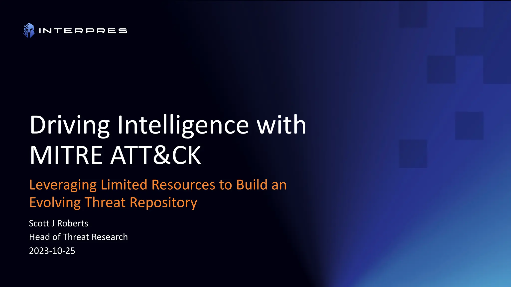 Scott J. Roberts, head of threat research at Interpres, discusses the integration of MITRE ATT&CK with their custom threat intelligence system to optimize defense readiness while managing limited resources. The presentation outlines goals related to depth, breadth, speed, and accuracy of threat research, addressing challenges with STIX2 compatibility. Future plans involve leveraging STIX2 while enhancing automation and developing a more effective code-based intelligence framework.