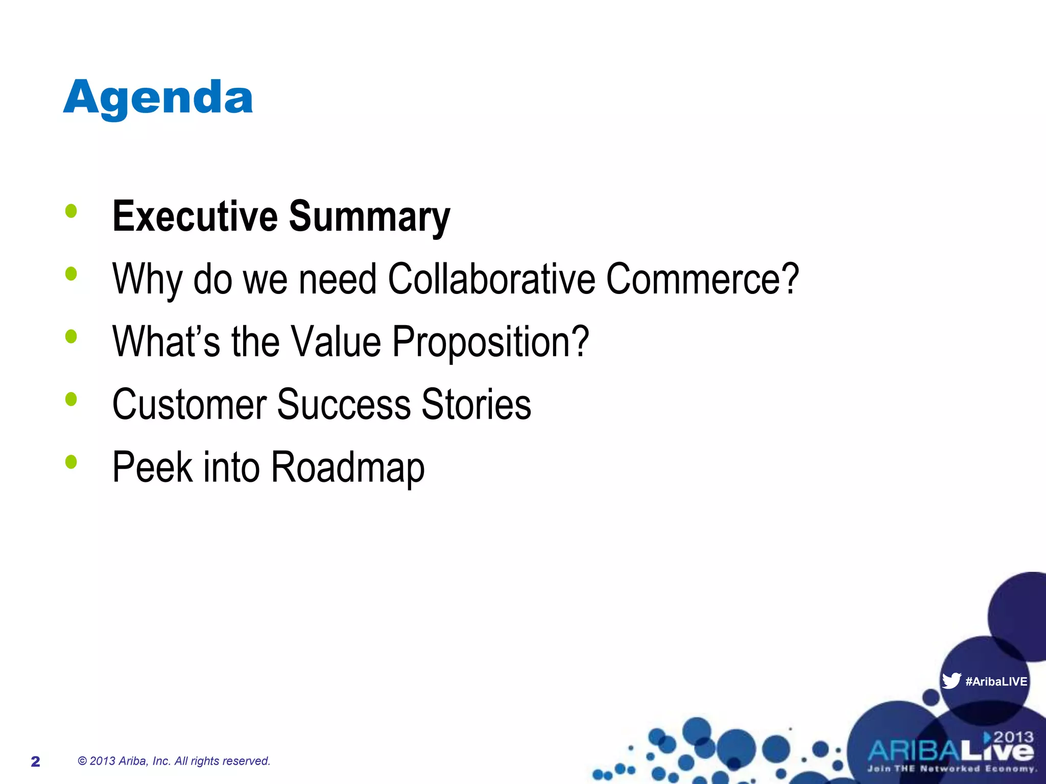 Ariba Collaborative Commerce provides a cloud-based solution that extends procurement capabilities across a company's extended supply chain. It allows for easy catalog use, purchase order automation, invoice automation and receipt, and supplier enablement on Ariba's business network. Customer case studies showed benefits like 15% increased solution adoption, 30% improved invoice processing, and 99.99% first-time invoice matching. The presentation provided an overview of the solution's capabilities and customer success stories.