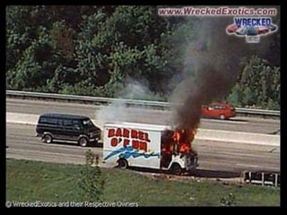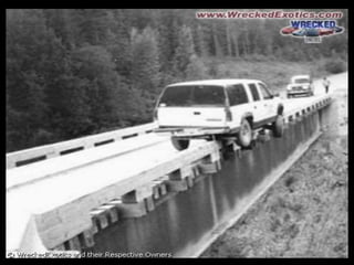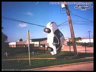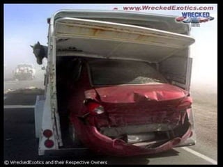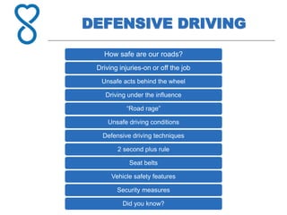 The document discusses various aspects of driving safety. It provides statistics showing that most traffic accidents are caused by driver error. It discusses unsafe driving behaviors like distracted driving, driving under the influence, and road rage. It also covers defensive driving techniques, vehicle safety features, and how to stay safe on the road.