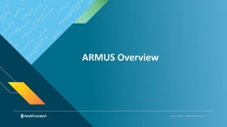 The document presents Armus solutions by Health Catalyst, highlighting their capabilities in clinical registry software, which features streamlined data entry, improved analytics, and reduced data abstraction times. The platform enhances data quality and supports various clinical registries, evidenced by Johns Hopkins Medicine's successful implementation that improved efficiency and accuracy in registry submissions. It emphasizes actionable insights through comprehensive reporting and dashboards, ultimately aimed at boosting clinical outcomes.