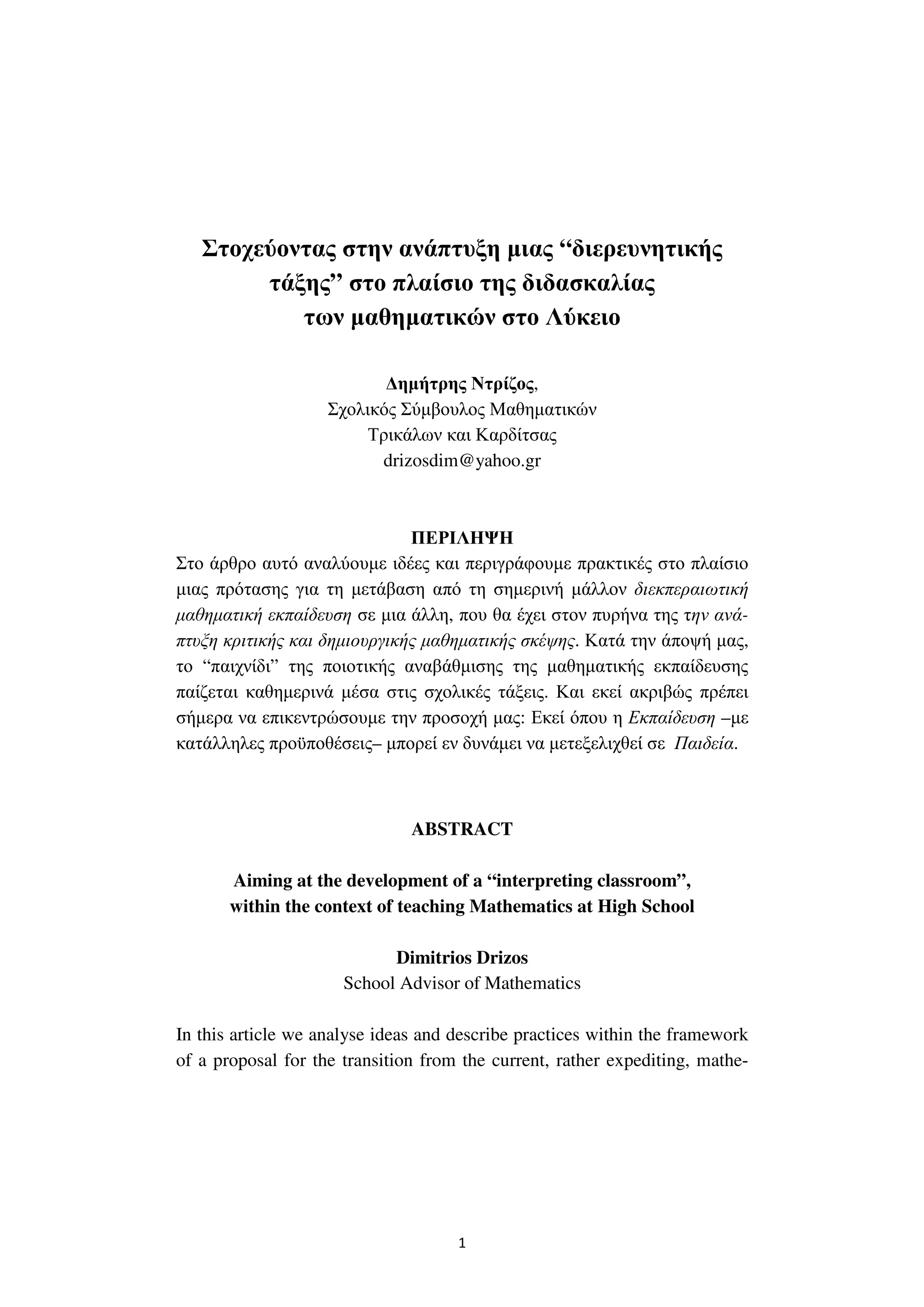 1.1 Η ∆Ι∆ΑΣΚΑΛΙΑ Τ Ν ΜΑΘΗΜΑΤΙΚ Ν: ΠΡΟΤΑΣΕΙΣ ΚΑΙ