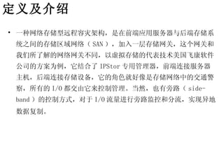 该文档介绍了一种基于存储区域网络(SAN)架构的存储虚拟化数据复制解决方案,它通过存储网关实现不同存储资源的整合与管理。主要优点包括提升存储利用率和管理员工作效率,同时避免了设备品牌的依赖,但存在与存储网关相关的单点故障风险。适合预算有限且设备多样的客户,以及需要远程灾备的中大型企业。