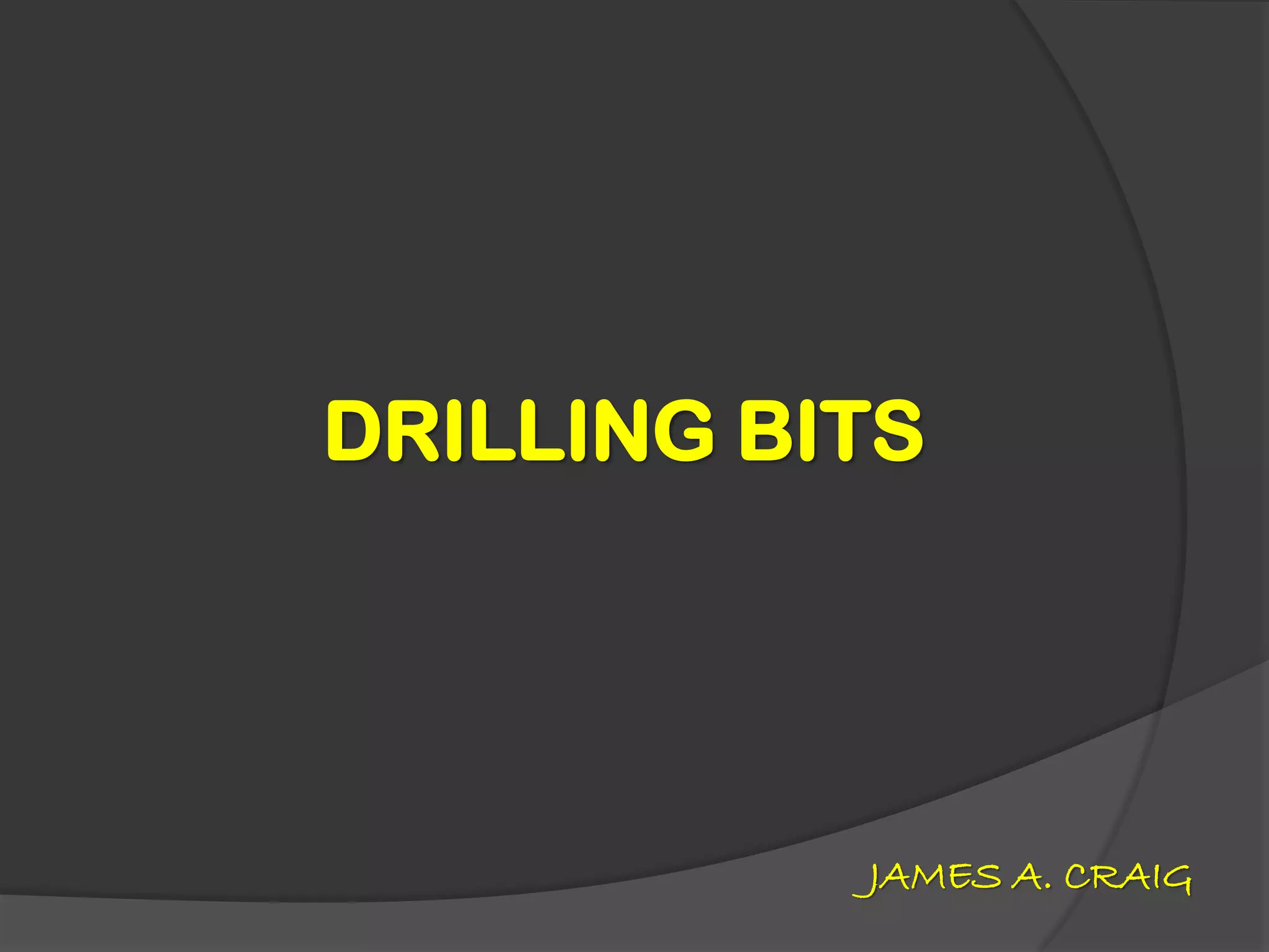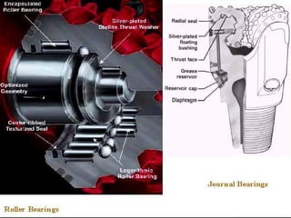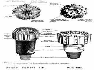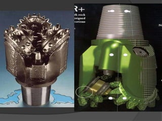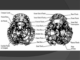 The document discusses different types of drill bits used in drilling operations, including drag bits and roller cutter bits. It describes the components and functioning of each type of bit. The document also covers drill bit classification systems used to categorize bits based on attributes like cutter type, profile, and intended formation. Drill bits are graded after use based on tooth wear, bearing wear, and gauge wear.