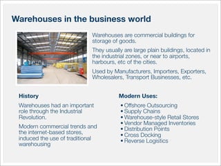 This document summarizes warehouses and workshops, including their history and modern uses. It then describes the benefits of prefabricated warehouses and workshops constructed with steel frames. Prefabricated structures offer cost and time savings over traditional construction methods. They are durable, environmentally friendly, and easy to assemble on site. Key components include hot-dipped galvanized or painted steel frames, insulated wall and roof panels, and doors and windows customized for different applications.