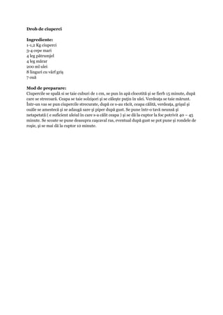 Rețeta de drob de ciuperci include ingrediente precum ciuperci, ceapă, pătrunjel, mărar, ulei, griș și ouă. Prepararea implică fierberea ciupercilor, călirea cepei și amestecarea tuturor ingredientelor, care apoi se coace timp de 40-45 minute. La final, se poate adăuga cașcaval ras și rondele de roșie înainte de a mai fi pus în cuptor pentru 10 minute.
