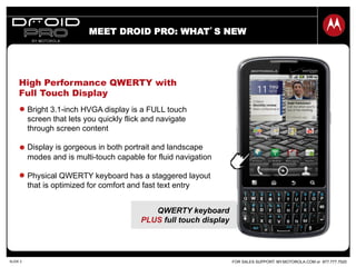 The document provides information on the Droid Pro smartphone by Motorola, highlighting its key productivity, security, and personalization features. It includes three slides summarizing the device's business capabilities, competitive advantages, and example use cases. The remaining slides provide instructions on setting up email and global dialing, scheduling meetings, and global roaming settings.