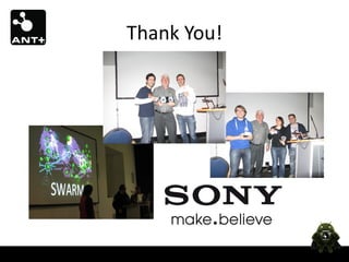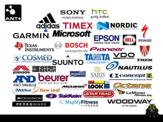 ANT is an ultra low power wireless protocol that can communicate for years using a single coin cell battery. It allows hundreds of transmitters to coexist on the same RF channel without collision. ANT networks can be built in various topologies including point-to-point, broadcast, star, shared, and asynchronous configurations. ANT+ defines common data formats for what information is sent over ANT networks. The Android ANT API and ANT+ profile plugins make implementing ANT+ applications simpler through a common interface and by handling device discovery and data interpretation.