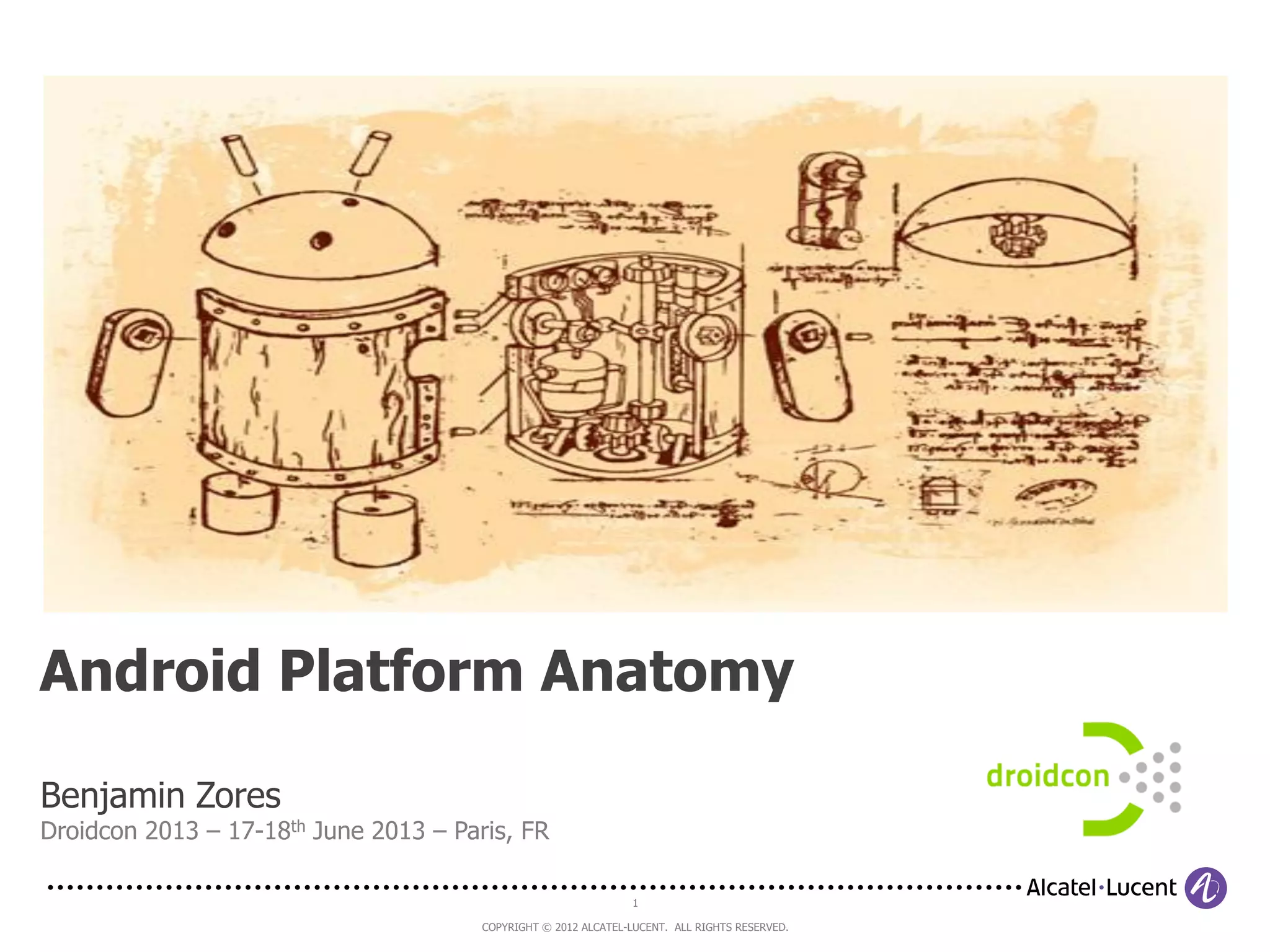 The document discusses Benjamin Zores' presentation on Android platform anatomy. It includes an overview of Zores' background and experience with Android and open source projects. It then covers topics like the history of Android releases, the Android system architecture, sources for Android development, the device porting process, hardware requirements, and components of the Android kernel and user-space.