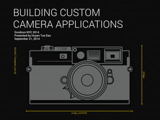 The document presents a detailed guide on building custom camera applications for Android, covering camera setup, image capture, and parameters. It discusses essential permissions, surface management, and provides insights on the new Camera API introduced in Android L. Additionally, it highlights key features and considerations for optimizing camera functionality across different devices.
