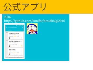 This document discusses DroidKaigi 2018 and contributing to the conference app repository on GitHub. It provides links to the conference app repositories from 2016 to 2018 on GitHub and encourages contributions. It also provides instructions on how to contribute, including forking the repository, making changes in Android Studio, committing and pushing to GitHub, and creating pull requests.