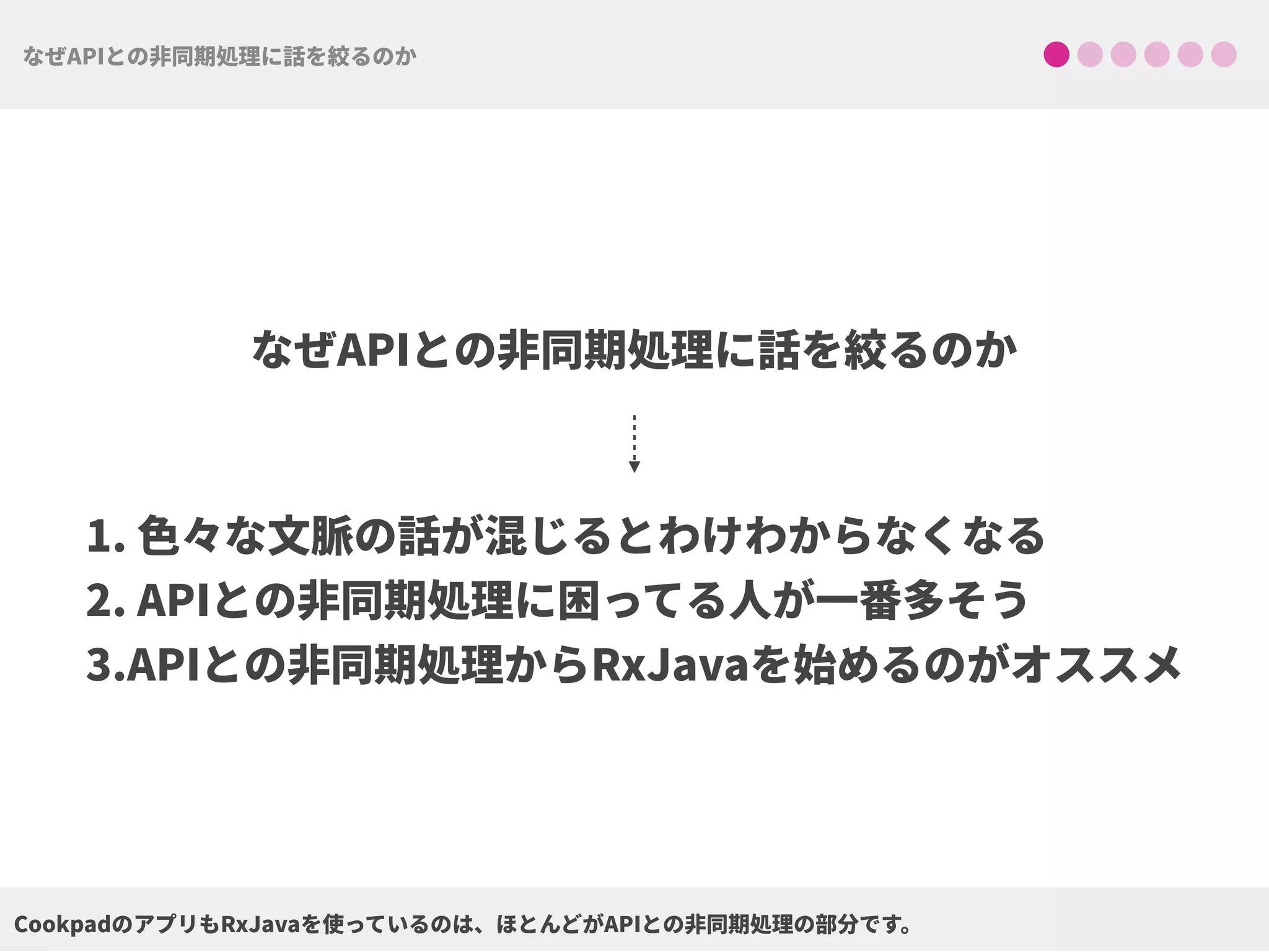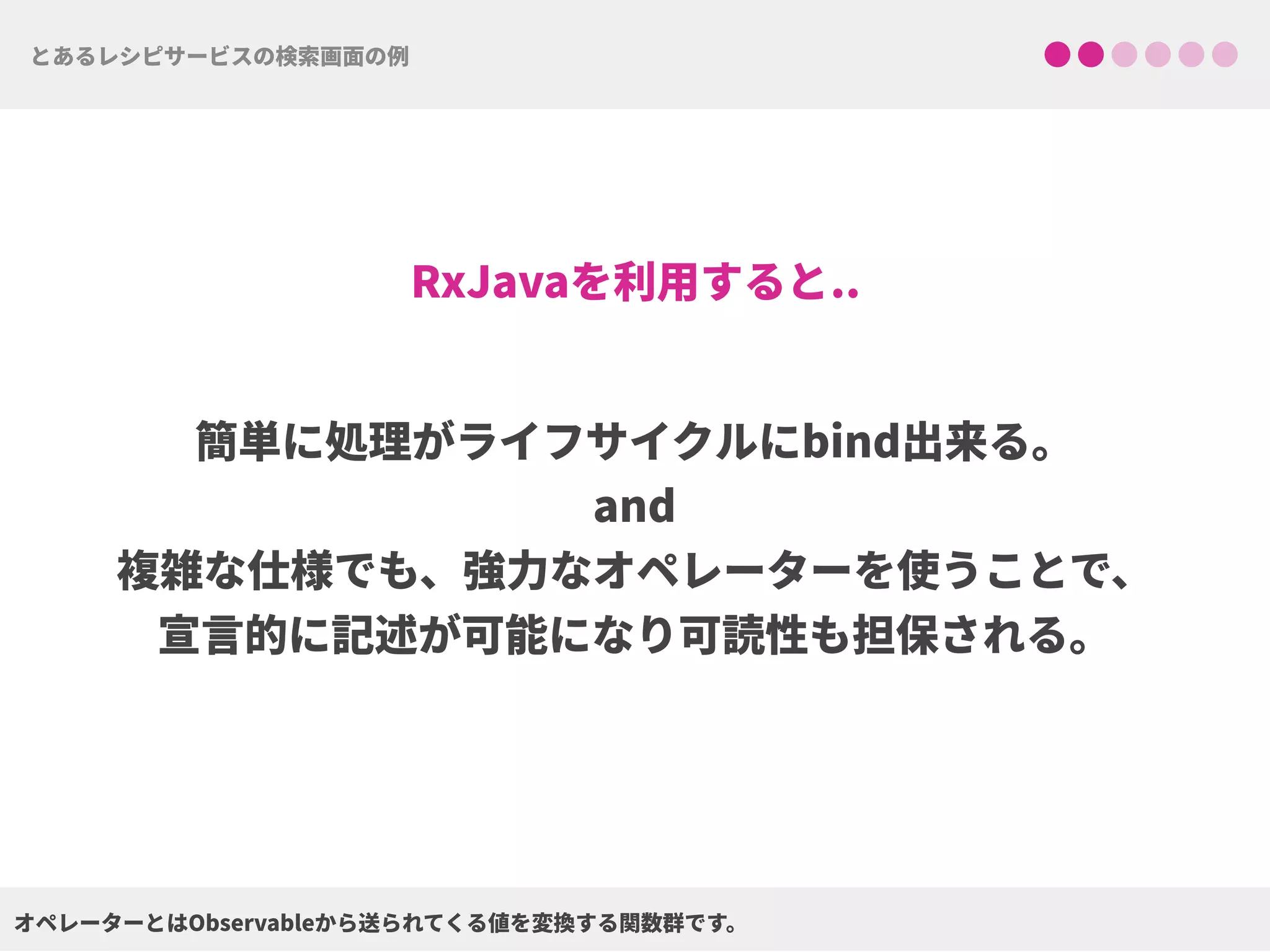 The document describes how to use RxJava to make asynchronous API calls and handle the results. It defines a searchRecipe method that returns an Observable object to search for recipes by keyword. Subscribers can subscribe to the Observable and handle the onNext, onError and onCompleted events to update the UI in response to the API call results. Operators like map, subscribeOn and observeOn are used to modify the Observable stream and control threading.