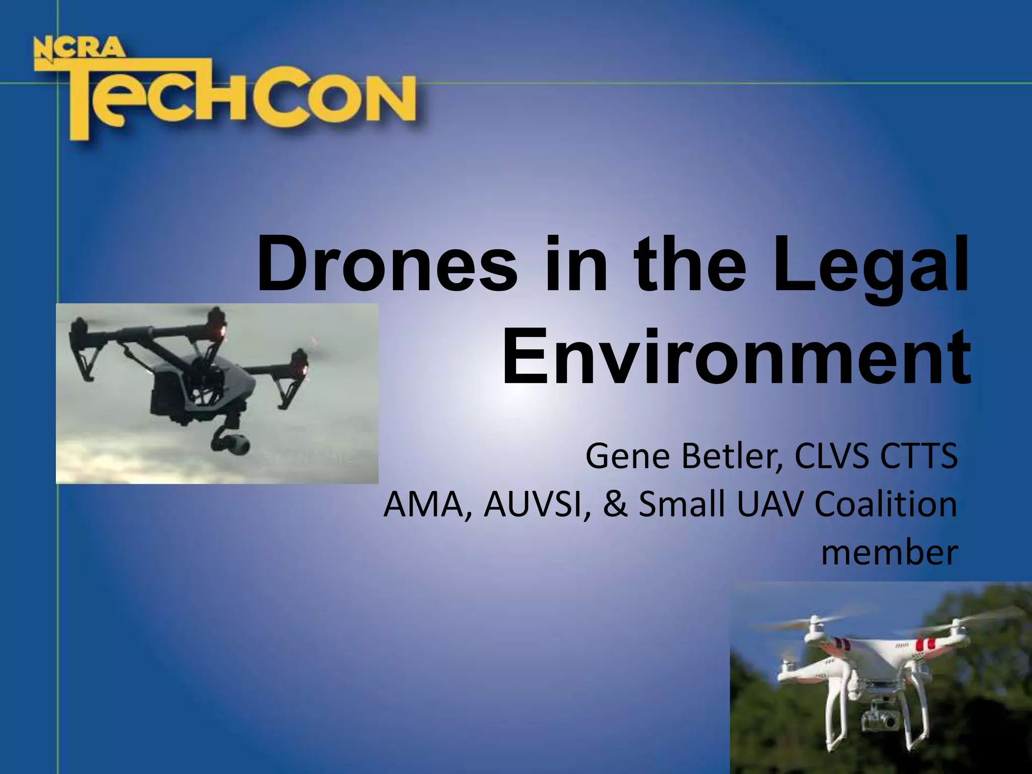 This document discusses the use of drones in the legal field and provides an overview of regulations. It notes that drones allow for affordable aerial photography and videography for any size legal case. Regulations for hobbyist drone use require operating strictly for recreation under AMA guidelines within visual line of sight. Commercial use requires FAA approval as a licensed pilot and operating under proposed Part 107 rules such as daylight-only operation, visual line of sight, maximum airspeed and altitude. The document outlines proposed operator certification requirements and aircraft must be registered and safely maintained. Microdrones under 4.4 pounds may have additional operational flexibility with certification. Overall, the document presents the opportunity drones provide for legal applications and summarizes current and proposed regulations.