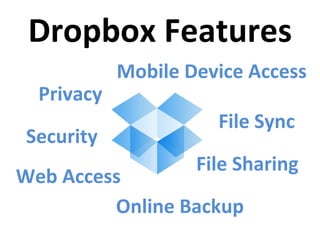 Dropbox allows users to sync, share, and access files across multiple devices. It offers 2GB of free online storage, syncing of files for Windows, Mac and Linux computers, and efficient syncing that only transfers changed parts of files. Users can share folders with others, access files from any web browser, and download and view content on their iPhone. Pricing plans start at $9.99 per month for additional storage.