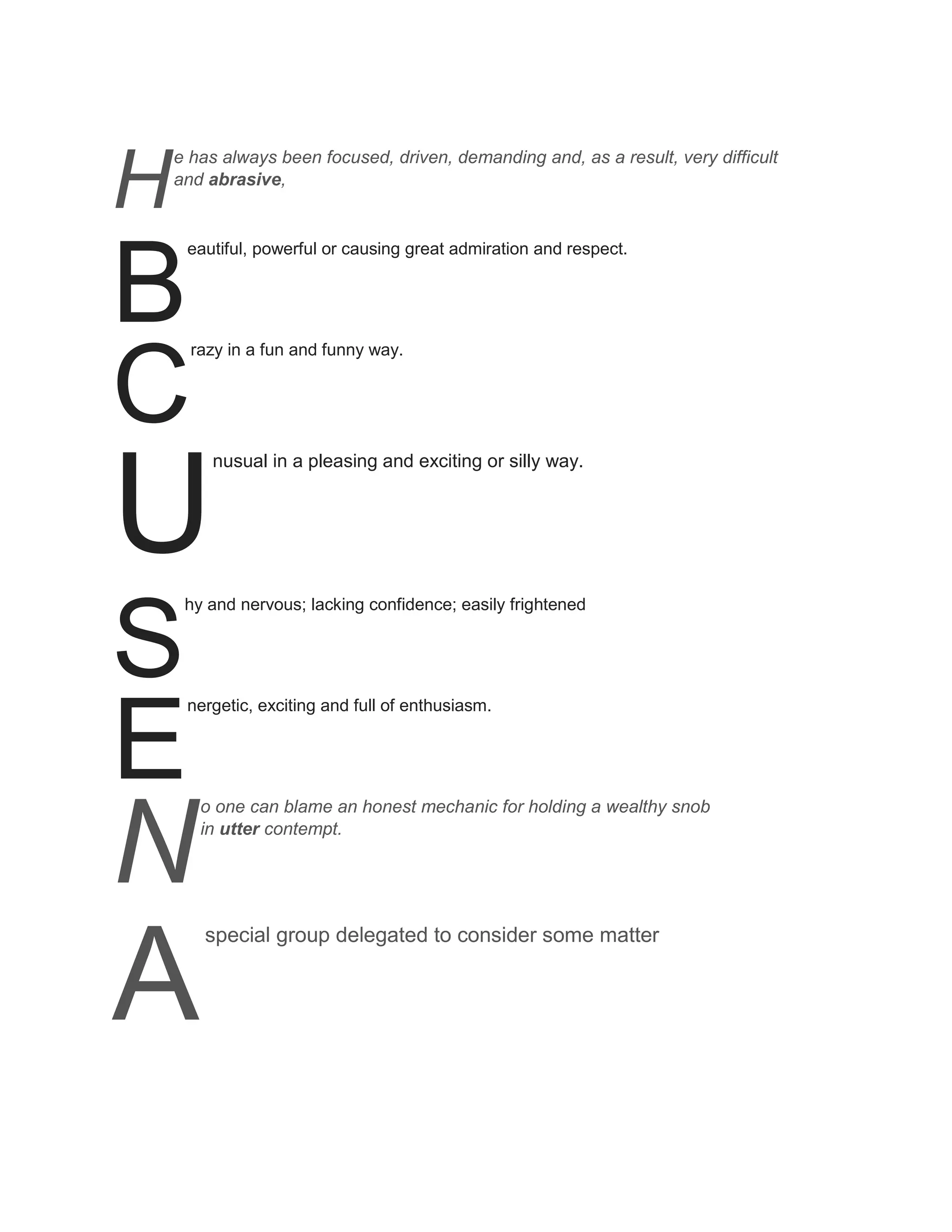The document contains a list of one-word descriptions that vary widely in their meanings from positive to negative, including focused, beautiful, crazy, unusual, shy, and energetic. It does not provide a clear overall topic or message when taken as a whole.