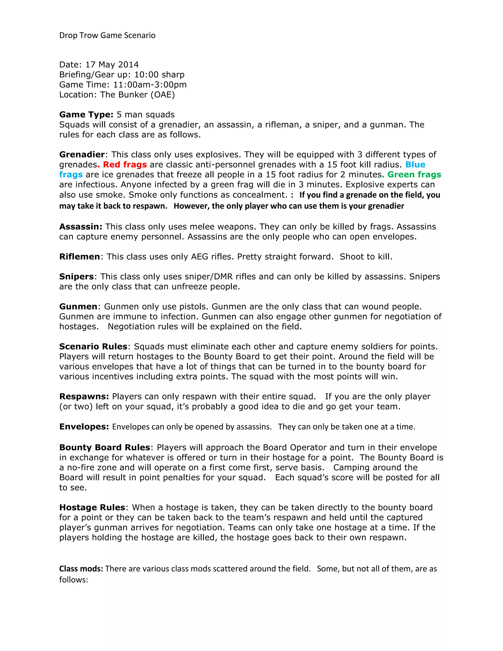 This document outlines the rules and scenario for a 5-person squad airsoft game called "Drop Trow". Squads consist of a grenadier, assassin, rifleman, sniper, and gunman with specific weapon and ability restrictions for each class. The objective is for squads to eliminate other squads by any means necessary, capture enemies for points, and exchange intel found in envelopes and hostages at the bounty board for further points. Various power-ups are hidden around the field that can temporarily modify class abilities. The squad with the most points at the end wins.