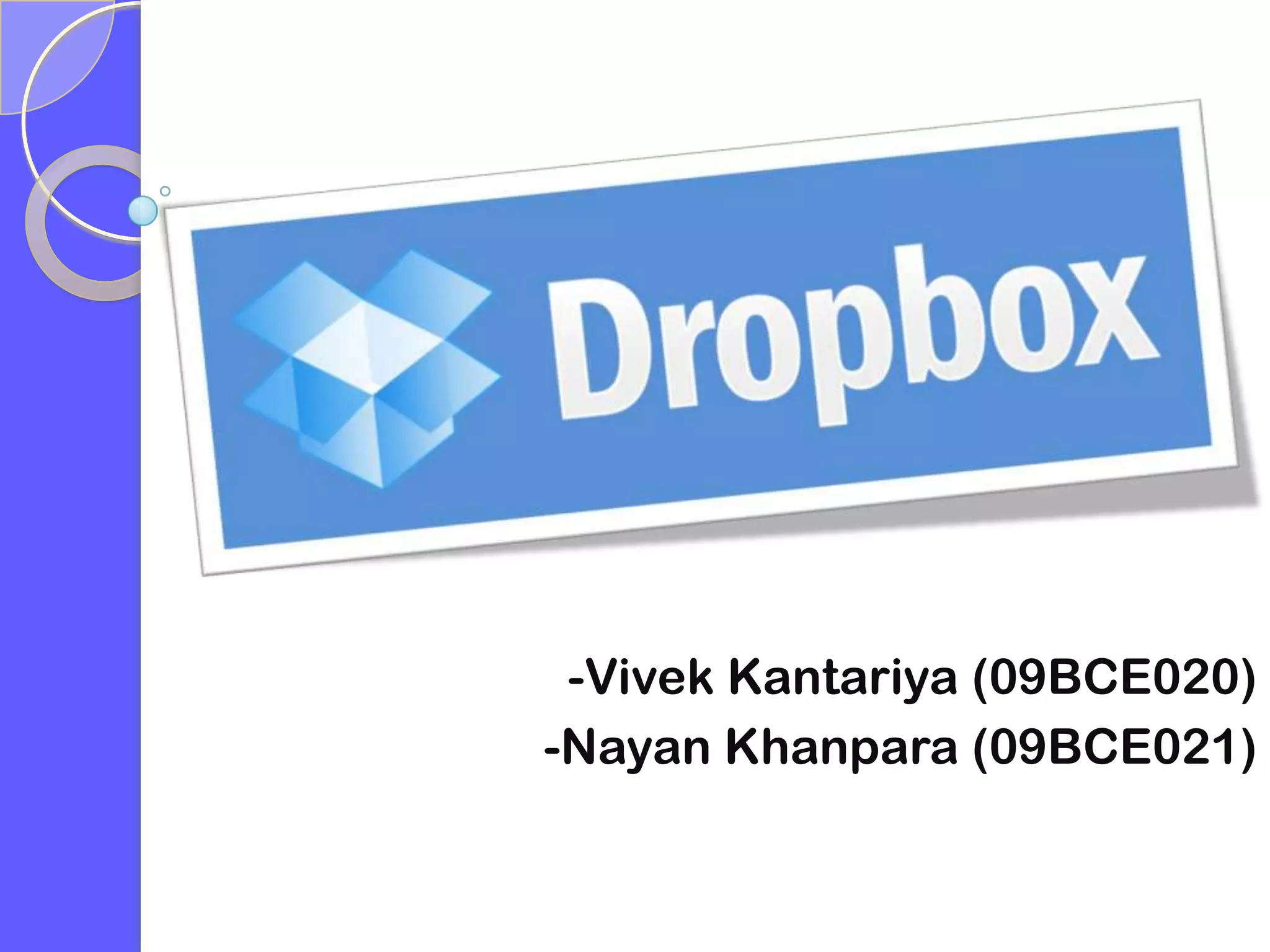 Dropbox is a file hosting service that allows users to store and share files across devices using cloud computing. It was founded in 2007 by Drew Houston and Arash Ferdowsi and has over 25 million users worldwide. Dropbox offers 2GB of free storage with options to purchase additional storage up to 100GB. It allows users to access and sync files across multiple devices and share files privately through links. Files are encrypted for security during transfers and storage on Dropbox servers.