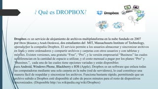 El documento describe Dropbox como una herramienta educativa. Explica que Dropbox permite a docentes y estudiantes almacenar y compartir archivos de forma fácil desde cualquier dispositivo. Esto facilita el trabajo colaborativo entre estudiantes y entre estudiantes y docentes, así como el intercambio de materiales educativos. Dropbox también ofrece funciones como historial de versiones que pueden usarse en contextos educativos.