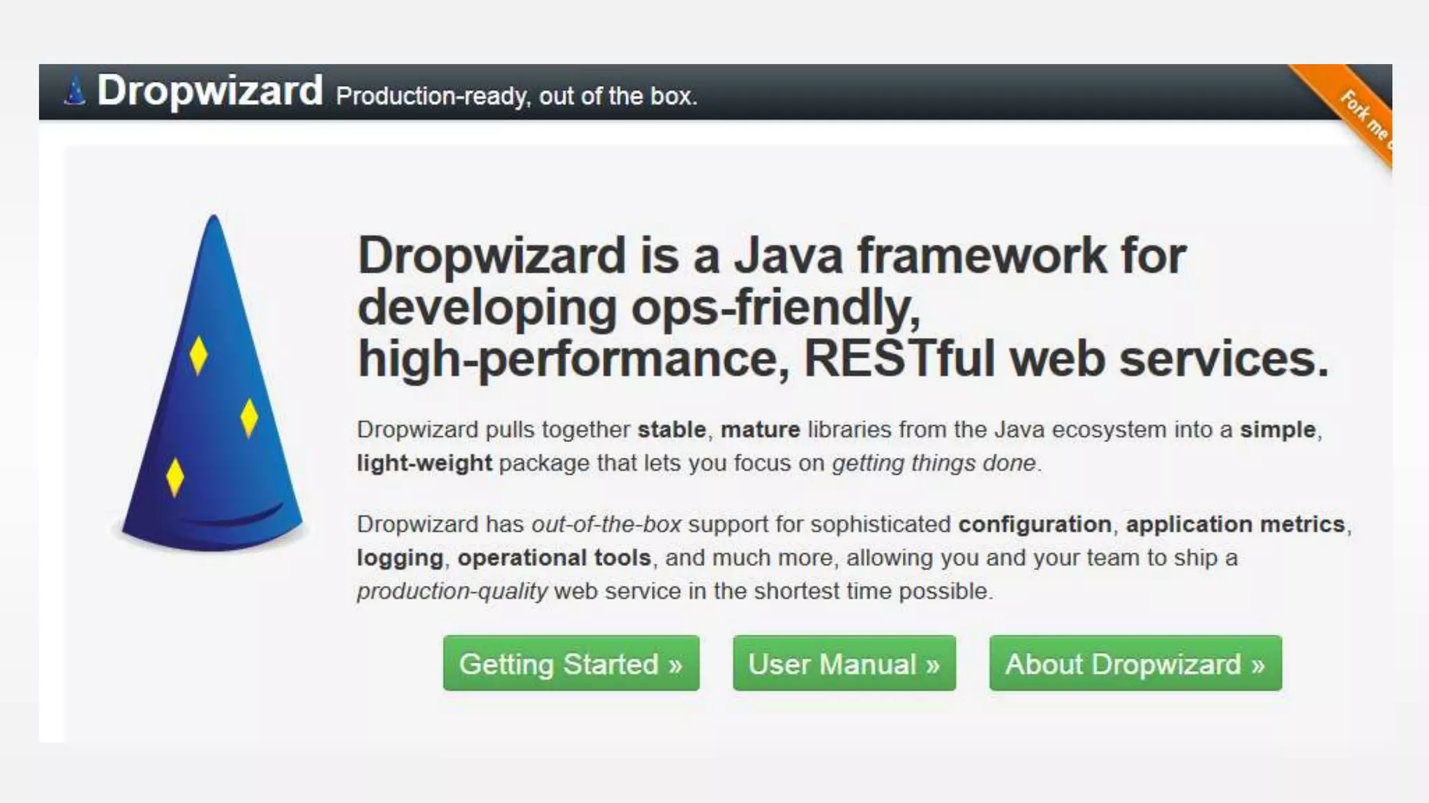 Dropwizard is a Java framework for building RESTful web services. It supports microservices architecture and includes modules for common functions like authentication, database access, metrics collection, and health checks. Developers define resources, configure the application via YAML, integrate with databases via JDBI, and build representations with Jackson. It aims to provide a productive full-stack framework for building microservices.