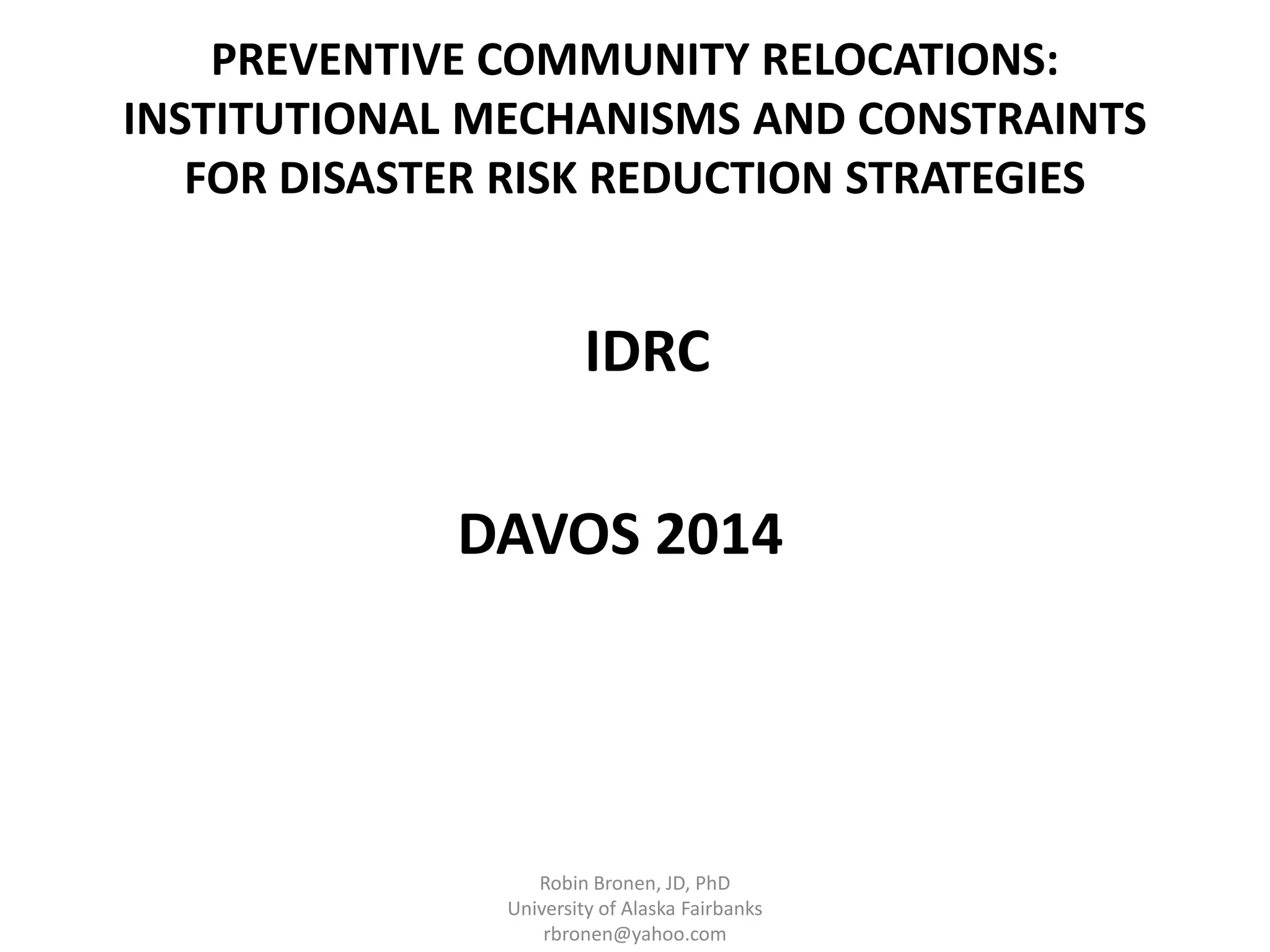The document discusses the need for preventive community relocations as a strategy for disaster risk reduction due to climate change impacts such as sea level rise and erosion. It emphasizes the importance of adaptive governance based on human rights principles and highlights examples from communities in the Philippines and Fiji that have faced forced relocation. The document also outlines indicators for assessing when relocation is necessary and underscores the collective right to self-determination for affected communities.