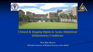Clinical and imaging inputs are important for diagnosing acute abdominal inflammatory conditions. A thorough history and physical exam can provide clues to the condition. Key lab tests include a CBC, CRP, and pancreatic enzymes. Imaging plays a crucial role, with ultrasound as a first-line exam and CT being the preferred modality. CT allows evaluation of the entire abdomen and detection of complications. The clinical presentation and location of pain can help determine the appropriate imaging exam and differential diagnoses to consider.