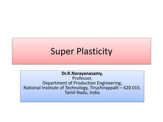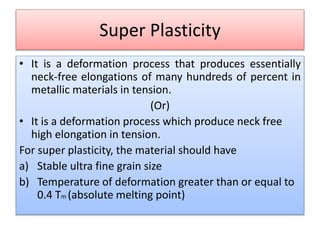 This document discusses super plasticity, which is a deformation process that produces high elongations in metallic materials during tension testing. For super plasticity to occur, the material must have an ultra fine grain size and be deformed at a temperature greater than or equal to 0.4 times the absolute melting point. The document outlines various constitutive relationships that describe super plastic deformation and discusses factors that influence strain rate sensitivity. It also examines conditions necessary for super plastic forming and methods for producing ultrafine grain sizes in materials.
