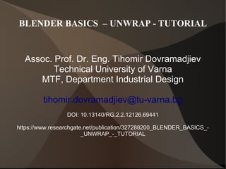 The document is a tutorial on using the Blender software for 3D design, specifically focusing on UV unwrapping techniques. It describes various methods for unwrapping 3D objects, including smart UV project, cylindrical, and spherical mappings, as well as the workflow for preparing UV layouts. Additionally, it discusses the concept of UV mapping and provides practical examples and references to further resources.