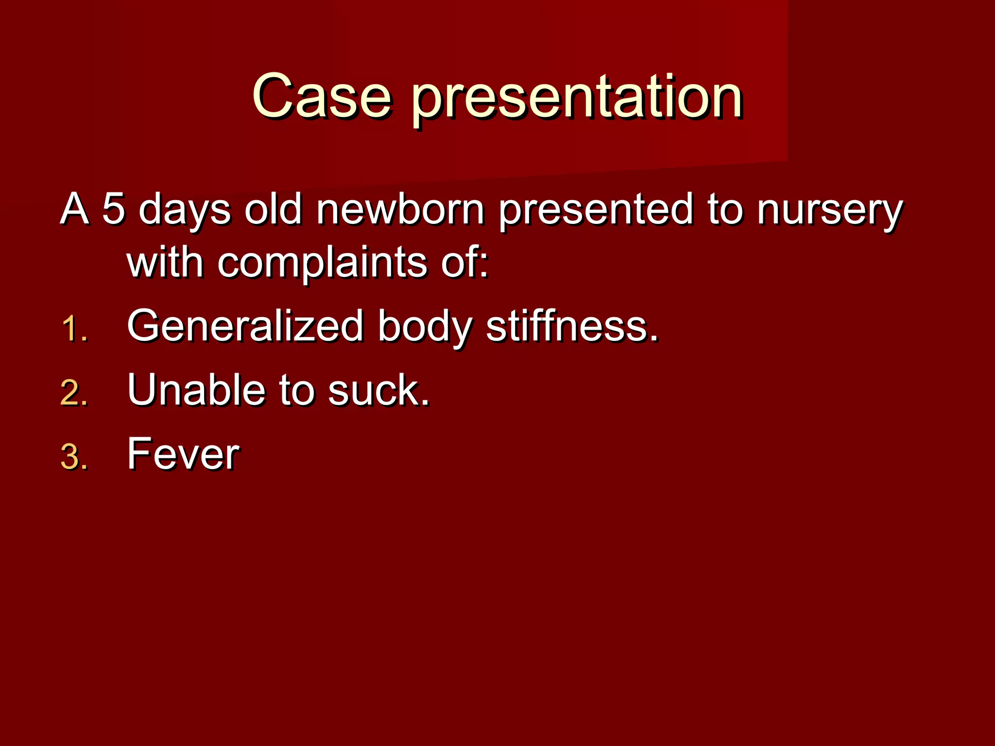 A 5-day-old newborn presented with generalized body stiffness, inability to suck, and fever. The baby was delivered at home by a traditional birth attendant, and the umbilical cord was cut with an unsterile instrument. On examination, the baby had generalized spasms triggered by stimuli, locked jaw, tense abdomen, and an infected umbilical cord. The diagnosis was neonatal tetanus. Neonatal tetanus results from infection of Clostridium tetani spores in the umbilical stump of newborns without protective immunity from unimmunized mothers. Management involves wound cleaning, antibiotics, antitoxin, sedation, feeding via NG tube, and supportive care