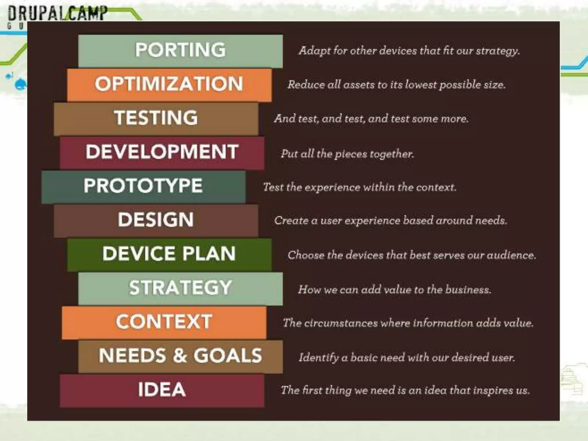 The document outlines considerations for developing a mobile site, including navigation elements, brand preservation, and device detection techniques. It discusses the use of various tools and modules such as WURFL and Drupal mobile plugins for enhancing mobile functionality. Additionally, it provides insights on testing methods across different devices and emulators.