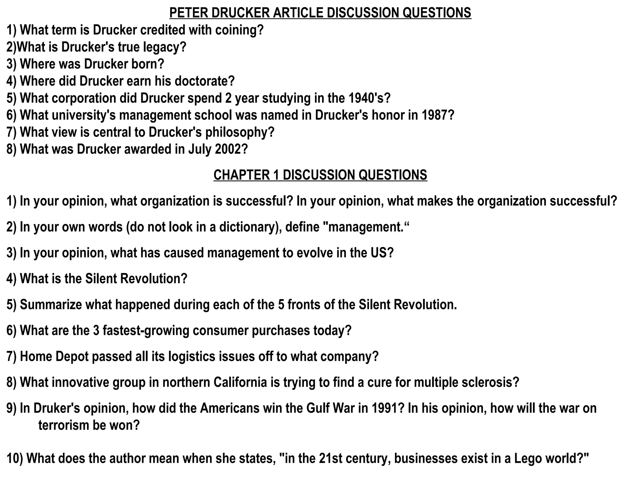 Peter Drucker is considered the father of modern management. He coined the term "knowledge worker" and believed that people and customers are an organization's most valuable assets. Drucker worked as a management consultant for major corporations. He received numerous honors for his contributions to management theory, including the Presidential Medal of Freedom. Successful organizations are defined by customer satisfaction, loyalty, profitability, market share, brand recognition, and perceived value. Management involves planning, organizing, staffing, leading, controlling, and motivating people to accomplish goals. The evolution of management in the US has been driven by wars, the industrial revolution, technology, and the rise of knowledge workers.