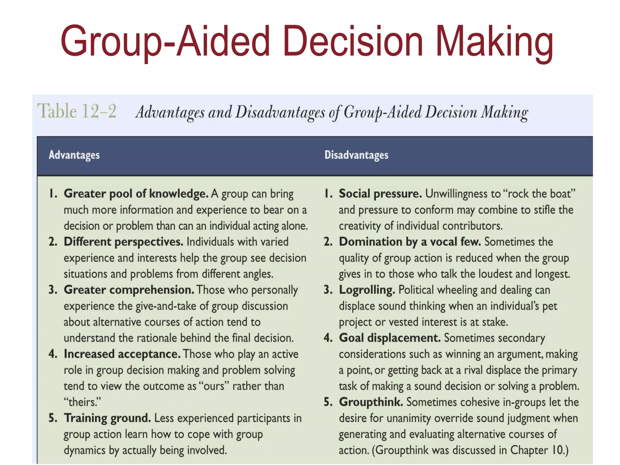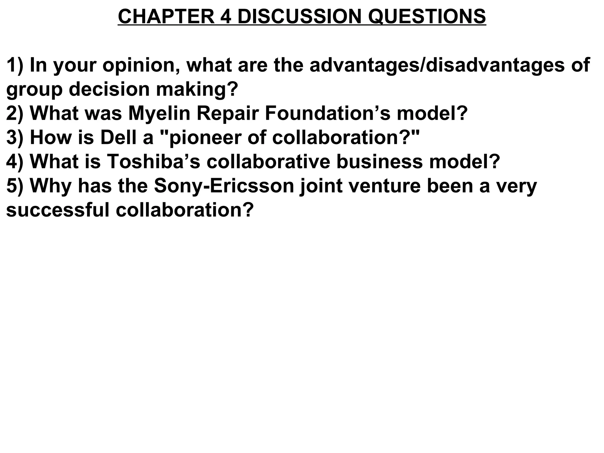 The document discusses collaboration and group decision making. It provides examples of collaboration models, including Myelin Repair Foundation working across universities, labs, and pharmaceutical companies to cure multiple sclerosis. Dell is described as a pioneer of collaboration by allowing customers to customize computers. The document also lists advantages and disadvantages of group decision making.