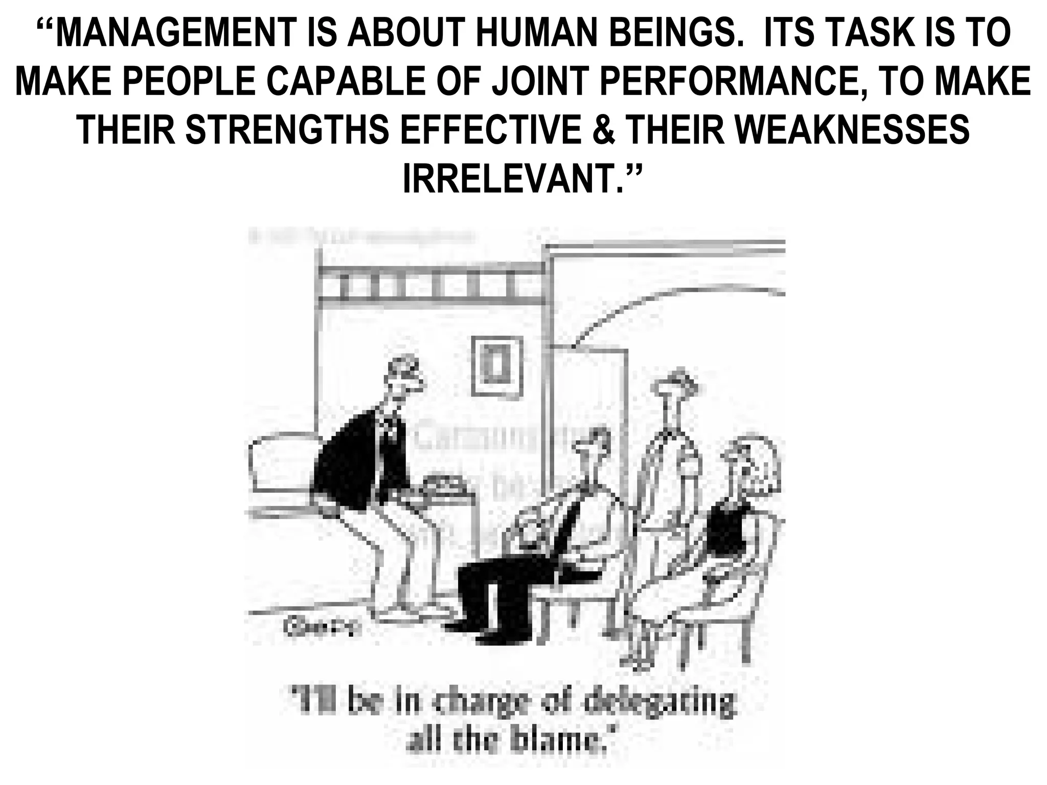 1) Management is about human beings and making their strengths effective and weaknesses irrelevant. Alcoa put this into practice by making a connection between human values, employee safety, and financial success through seeking to create an injury-free workplace.