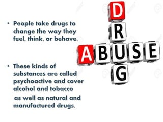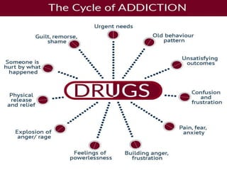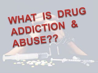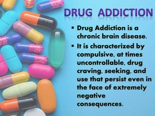 The document discusses drug addiction, covering types of substances, their effects, causes, and risk factors associated with drug abuse. It includes a case study of an individual named Roy who struggled with addiction, highlighting the impact of early exposure to alcohol and recovery efforts. Additionally, it offers strategies for avoiding and treating drug addiction, along with resources for further information.