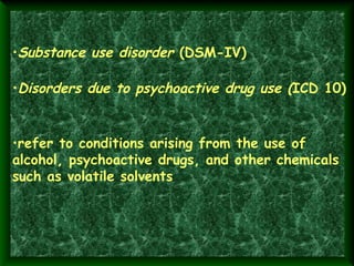 This document discusses substance abuse and provides definitions and classifications of commonly abused substances. It describes substance-related disorders according to the DSM-IV and ICD-10 and covers definitions of key terms like drug, tolerance, withdrawal syndrome, medical use, and non-medical use. The major classes of abused substances discussed include opioids, depressants, tranquilizers, stimulants, hallucinogens, cannabis, inhalants, and cocaine. Signs and symptoms of abuse and withdrawal are outlined for different substance classes. Principles of treatment include detoxification, abstinence, family involvement, screening, and self-help groups.