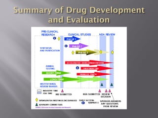 The document outlines the complex multi-step process of drug discovery and development from laboratory testing through FDA approval. It takes an average of 12 years and $350 million to get a new drug from initial discovery to pharmacy shelves. Drugs undergo preclinical testing followed by clinical trials in three phases with FDA review and approval required before market introduction. The FDA evaluates drugs based on evidence from clinical research to determine safety and efficacy.
