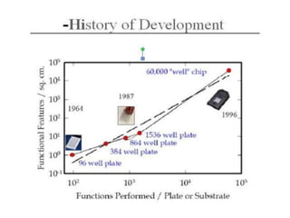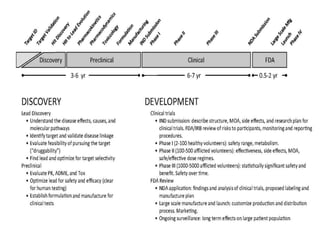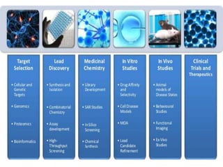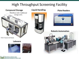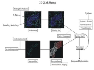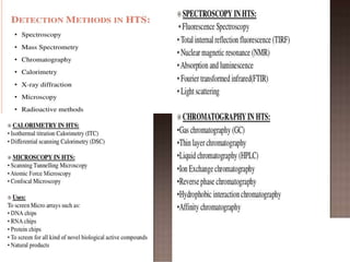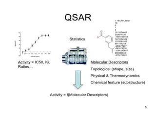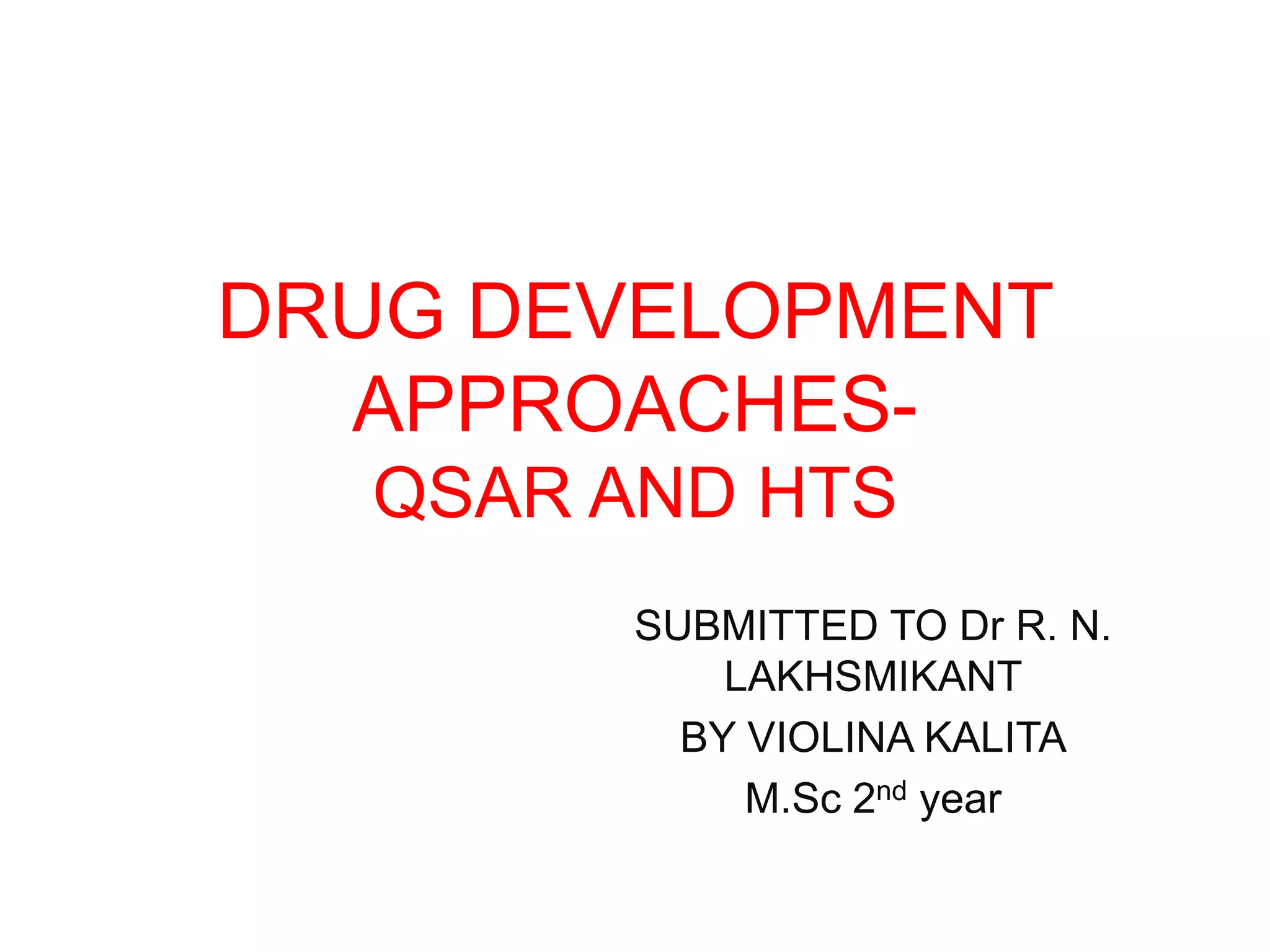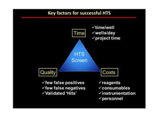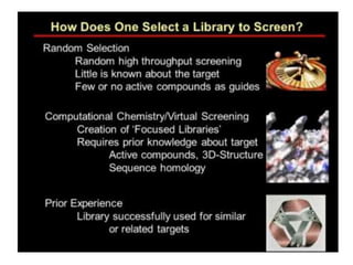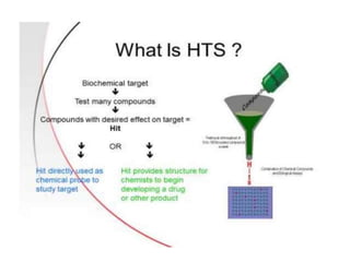 The document discusses approaches to novel drug development, specifically quantitative structure-activity relationship (QSAR) modeling and high-throughput screening (HTS). It provides background on QSAR, describing how it establishes mathematical relationships between molecular properties and biological activity. It also outlines the history, goals and process of HTS, noting it allows rapid testing of large numbers of compounds against biological targets to identify initial hits for further development.