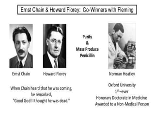 The document summarizes the key events in the discovery and development of penicillin. Alexander Fleming first discovered penicillin in 1928 after noticing bacteria-killing properties of the Penicillium mold in one of his petri dishes. However, he was not able to purify or characterize penicillin at the time. In the 1940s, a team at Oxford led by Howard Florey and Ernst Chain managed to purify and mass produce penicillin, paving the way for clinical trials. The first successful human trials demonstrated penicillin's ability to cure bacterial infections. By the mid-1940s, large-scale production was established. Fleming, Florey and Chain received the 1945 Nobel Prize for their discoveries. Over time, resistance