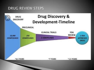 The document outlines the drug development process, detailing stages such as discovery, preclinical, and clinical trials, and the submission of investigational new drug applications (IND) to the FDA. It explains the methodology behind drug testing for safety and efficacy, including toxicology, pharmacokinetics, and the optimization of lead compounds. Additionally, it highlights the importance of clinical trials in bringing new treatments to market, along with their various types and the requirements needed to initiate them.