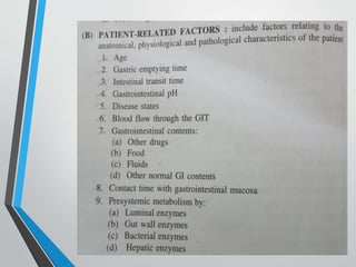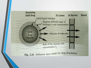 The document discusses drug dissolution, detailing the mechanisms and factors influencing gastrointestinal absorption of drugs administered orally. Multiple theories of dissolution, such as the diffusion layer model and Danckwert's model, are explained, along with factors affecting dissolution rates like physicochemical properties, formulation aspects, and processing conditions. Key parameters influencing drug solubility and dissolution are identified, emphasizing the complexity of drug absorption and distribution into systemic circulation.