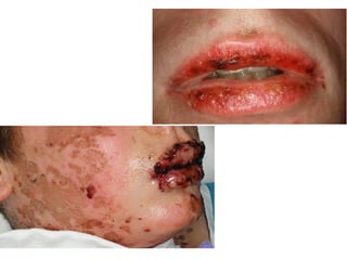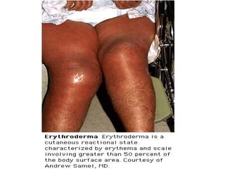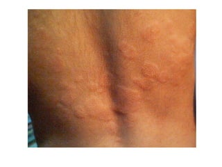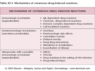 The document outlines various drug eruptions, emphasizing their definitions, incidence, types, and management strategies. It details the pathophysiology of different allergic reactions, diagnostic approaches, and specific conditions such as DRESS syndrome, Stevens-Johnson syndrome, and fixed drug eruptions, including their causes and treatments. Overall, it stresses the importance of identifying the offending agent and provides guidance on the therapeutic measures required for managing drug-induced skin reactions.