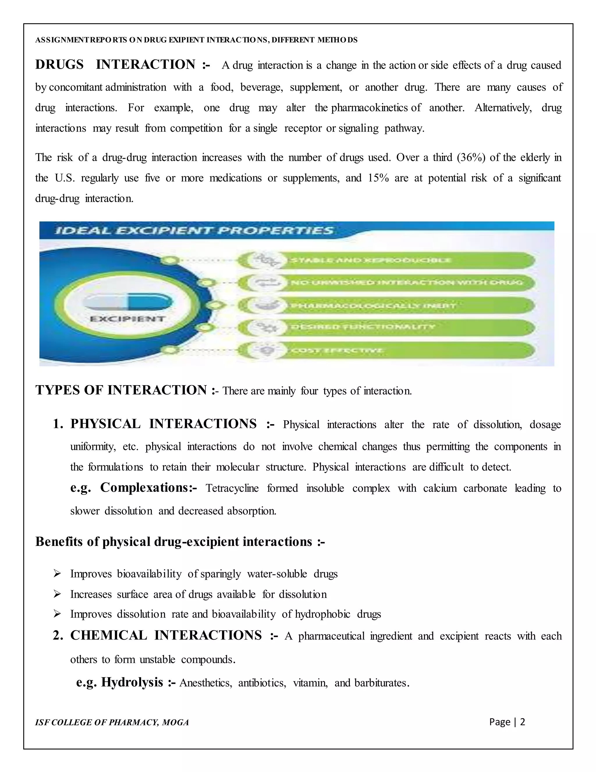 This document discusses drug-excipient interactions and methods used to detect compatibility between drugs and excipients. It defines excipients as inactive ingredients used to deliver active pharmaceutical ingredients. There are four main types of drug-excipient interactions: physical, chemical, biopharmaceutical, and excipient-excipient. Analytical techniques like differential scanning calorimetry, vibrational spectroscopy, thin layer chromatography, and high performance liquid chromatography are used to detect interactions. Detecting interactions is important to ensure stability of drug formulations and avoid problems during development and production.