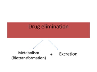 Drugs are eliminated from the body through metabolism and excretion. The major routes of excretion include renal (kidney), biliary (bile), fecal, alveolar (lungs), and minor routes like skin, saliva, sweat, hair, and milk. The kidney is the most common route and filters drugs through glomerular filtration while tubular secretion and reabsorption also influence renal excretion. Certain drugs can interact by competing for tubular secretion. Biliary excretion and enterohepatic circulation recirculate some drugs through the liver and intestines. Adjusting urine pH can enhance the excretion of acidic or alkaline drugs. Accumulation may occur if drugs rely on renal excretion and