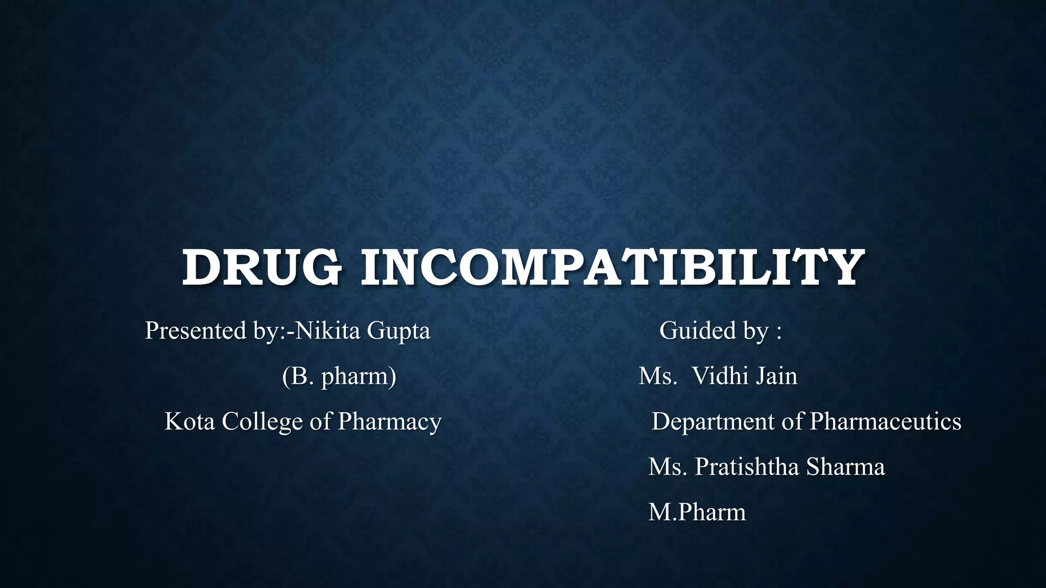 The document discusses drug incompatibility, which occurs when two or more substances produce undesirable effects on pharmaceutical preparations, affecting safety, efficacy, and appearance. It categorizes incompatibility into physical, chemical, and therapeutic types, detailing the causes and examples of each, such as immiscibility, oxidation-reduction reactions, and dosage errors. Understanding these incompatibilities is crucial for ensuring proper drug formulation, dispensing, and administration.