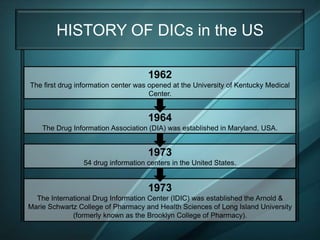 The first drug information center opened in 1962 at the University of Kentucky Medical Center. By 1973 there were 54 drug information centers in the United States. Drug information centers respond to inquiries about various drug-related topics like efficacy, interactions, dosage, and administration. The scope of their work focuses on ensuring the "five rights" of drug use - the right drug, dose, form, route and patient.