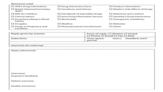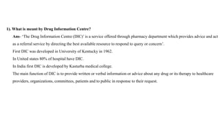 The document provides information about Drug Information Centres (DIC). It defines a DIC as a service that provides advice and refers queries about drugs to appropriate resources. DICs aim to promote evidence-based practice and improve patient care. They classify DICs as hospital-based, industry-based, or community-based. Clinical pharmacists working in DICs provide written or verbal drug information to healthcare professionals and patients. They respond to queries about various drug attributes like indications, dosages, interactions and side effects. When answering drug information questions, pharmacists gather background details, clarify the question, search multiple sources for relevant data, interpret the findings and formulate an appropriate response to address the query.