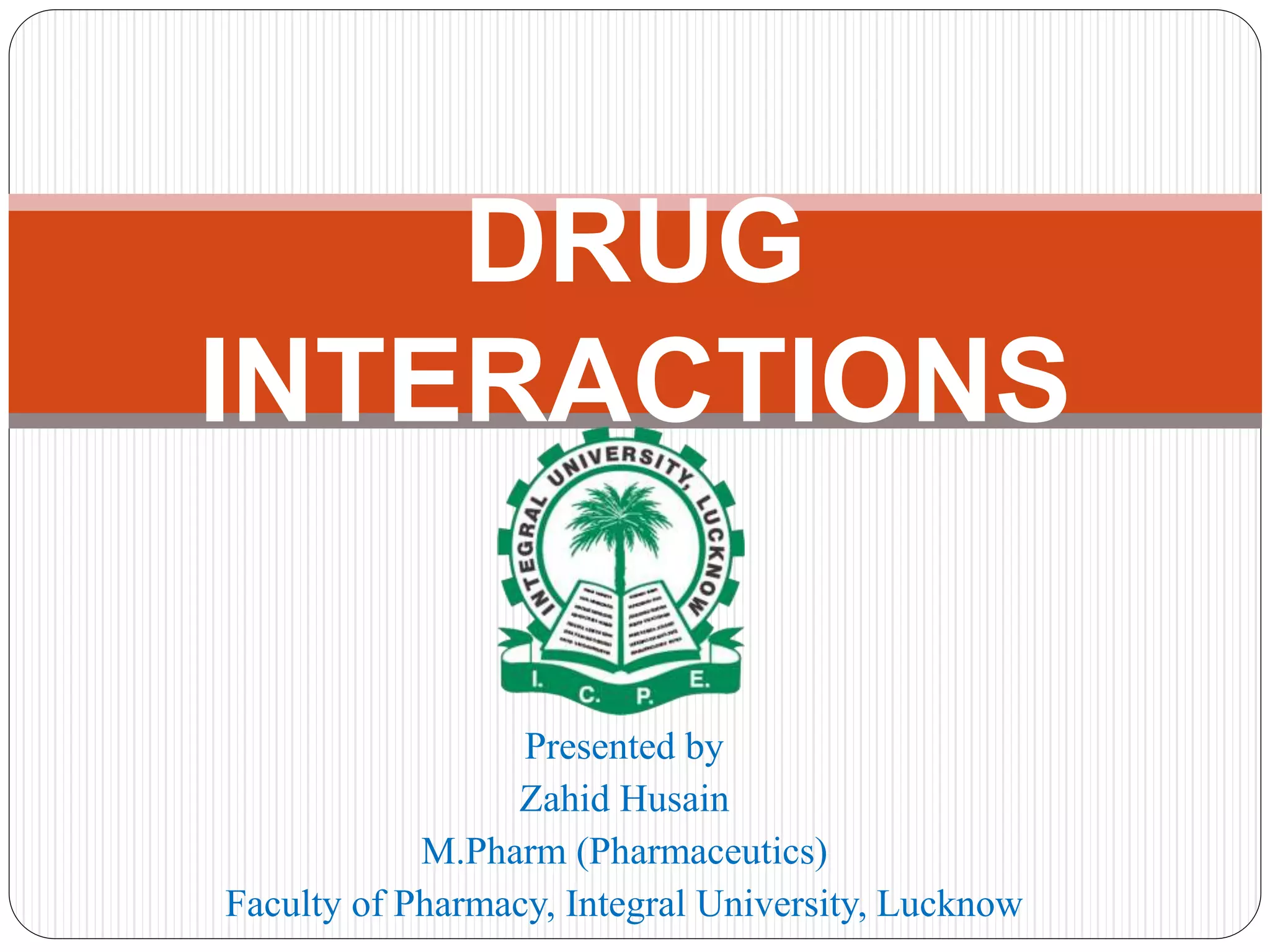 This document defines drug interactions and describes the main types and mechanisms. Drug interactions occur when one drug alters the effects of another drug. There are several types including drug-drug, drug-food, and drug-disease interactions. Mechanisms include pharmaceutical, pharmacokinetic, and pharmacodynamic interactions which can impact absorption, distribution, metabolism, excretion, or the pharmacological effects of drugs. Factors like multiple drug use, diseases, age, and non-compliance can contribute to interactions. Careful consideration of a patient's drug history and risks can help reduce negative interactions.