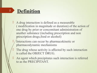 Drug interactions can occur through pharmacokinetic or pharmacodynamic mechanisms. Pharmacokinetic interactions involve effects on absorption, distribution, metabolism or excretion of drugs and can increase or decrease a drug's effects. Pharmacodynamic interactions involve drug actions at receptor sites and can cause additive, antagonistic or synergistic effects. It is important for clinicians to understand how drugs may interact and to monitor patients carefully when multiple medications are prescribed to avoid adverse reactions.