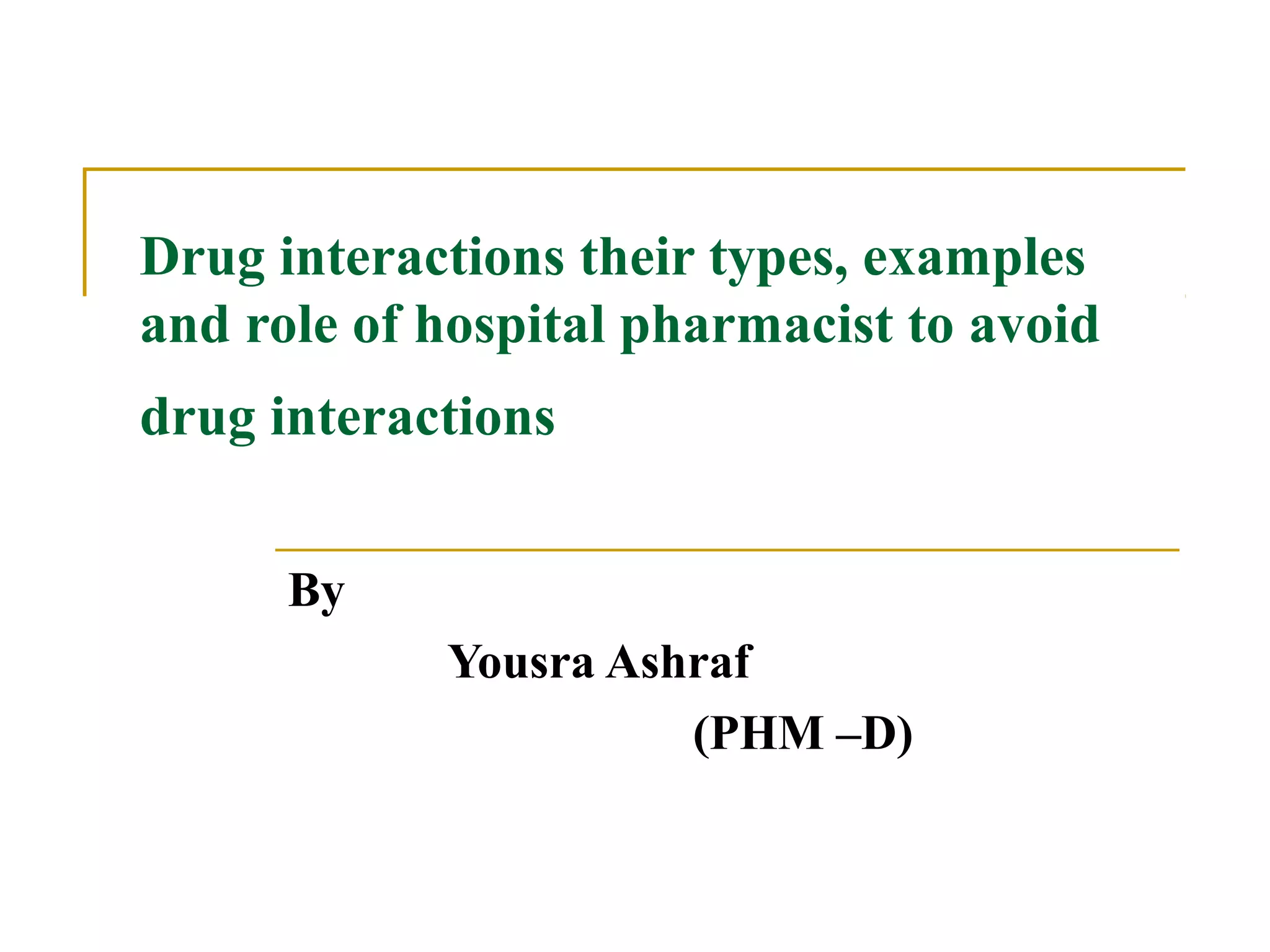 Drug interactions occur when two or more substances administered together alter their effects on the body. There are two main types of drug interactions - pharmacodynamic interactions, which involve drugs acting on the same receptors or tissues, and pharmacokinetic interactions, which alter a drug's absorption, distribution, metabolism, or excretion. Common examples of drug-drug interactions include aspirin increasing the effects of anticoagulants like warfarin and antibiotics affecting blood thinners. Food and disease can also interact with drugs. It is important for pharmacists to monitor for potential interactions and advise patients.