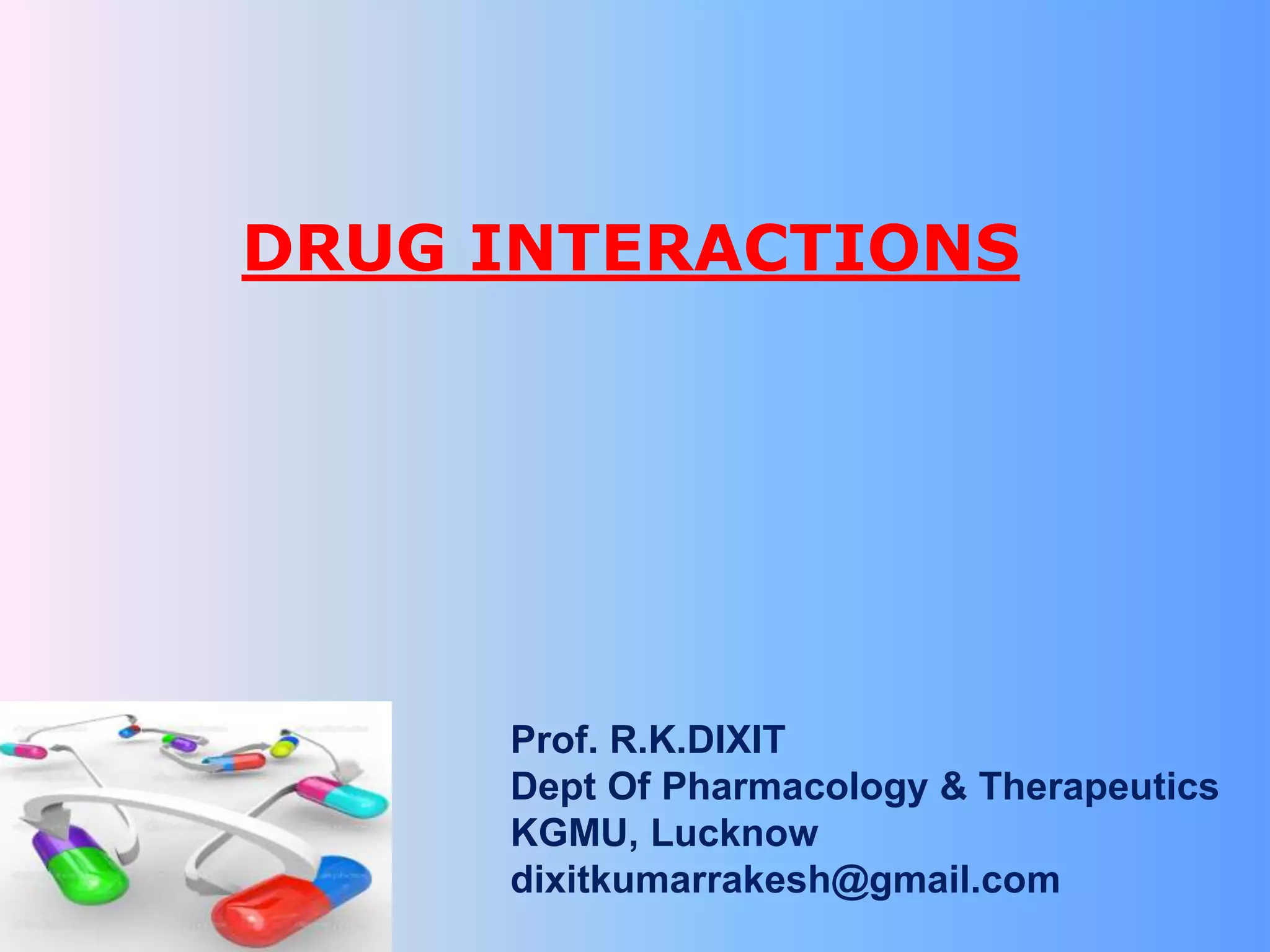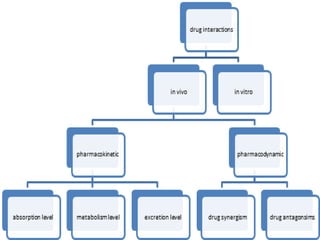 This document discusses drug interactions, which occur when two drugs administered together modify each other's effects. It describes several types of interactions, including pharmacokinetic interactions that affect absorption, distribution, metabolism and excretion of drugs, and pharmacodynamic interactions that occur at receptor sites. Specific drug combinations that can increase risks are provided as examples. The mechanisms of various interactions like enzyme inhibition and induction are explained. It emphasizes the importance of considering potential interactions when patients receive multiple medications from different doctors or have other risk factors.
