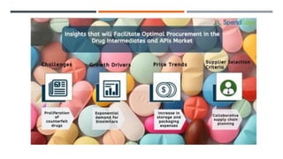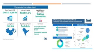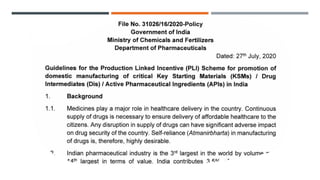 Bulk drugs and drug intermediates accounted for about 53% of India's total pharmaceutical imports in fiscal year 2020. India is highly dependent on imports for its drug intermediates and bulk drugs, sourcing over 60% from other countries, with over 65% coming from China alone. There are two main types of drug intermediates: advanced intermediates and active pharmaceutical ingredients (APIs), which are precursor materials used to produce finished drug formulations for therapeutic effects.